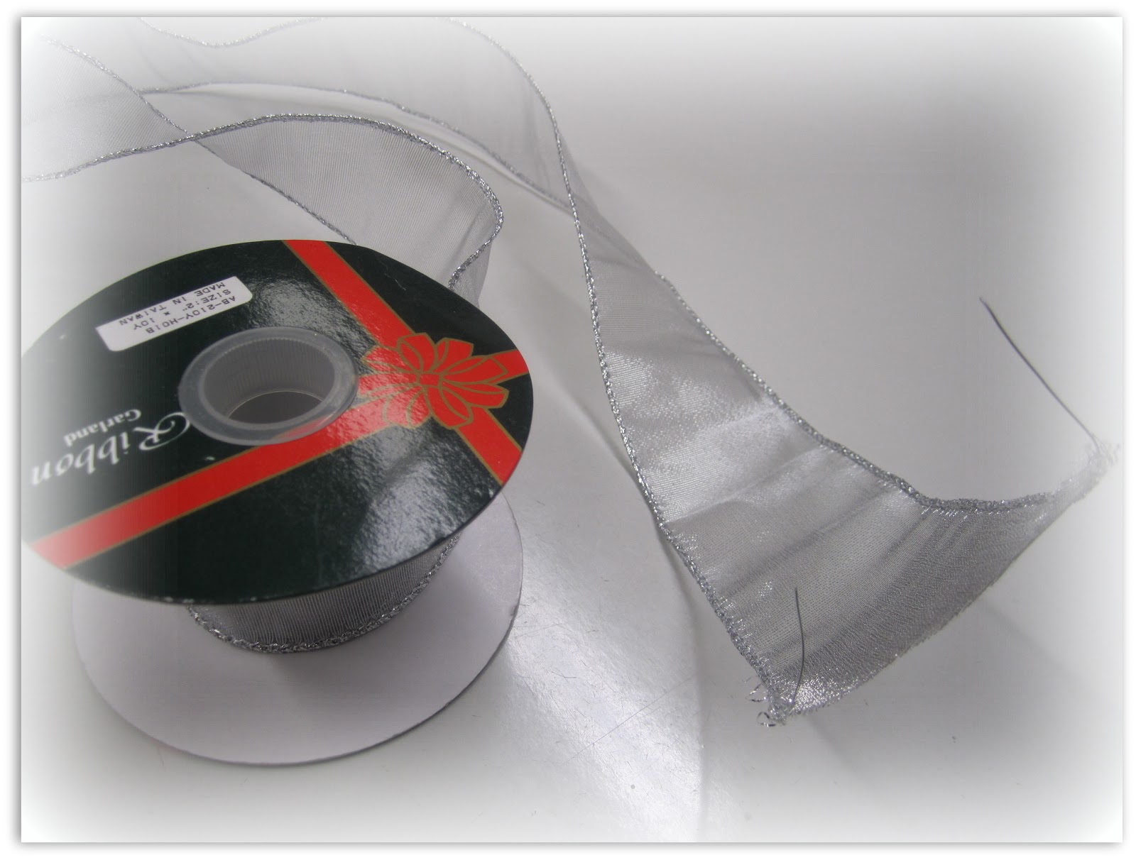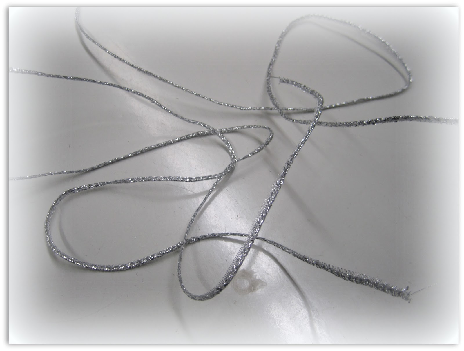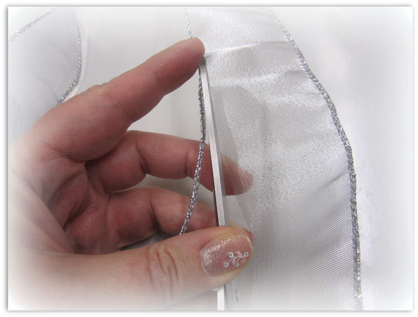 Leikkaa nauhaa n.1m pituinen pala. Leikkaa nauhan toisesta reunasta metallilanka irti. Tässä nauhassa metallilanka oli ommeltu hopeareunuksen sisään.