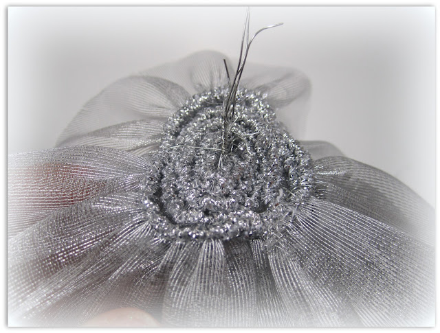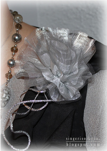 Olin tässä taannoin juhlissa, jonne pukeuduin musta- hopeanharmaaseen juhla-asuun. Hieman juhlavuutta korostaakseni värkkäsin asuni olkapäälle hopeisen ruusun. Ruusuketta suunnitellessani minulle kävi aivan uskomaton tuuri televisiota katsoessa. Siellä neuvottiin, kuinka valmistetaan juuri sellainen ruusuke, jota olin katsonut naisten vaateliikkeessä. Ohjelman nimi oli muistaakseni "Joulu Kristinen tapaan" tai jotain sinnepäin, kanava oli ehkä Ava.... harmi kun en tajunnut tallentaa ohjelmaa. Muutoinkin ohjelma oli a-i-v-a-n i-h-a-n-a, sillä siellä neuvottiin kuinka valmistaa saippuaa, joulukoristeita jne. Sattuiko kukaan muu katsomaan kyseistä ohjelmaa?