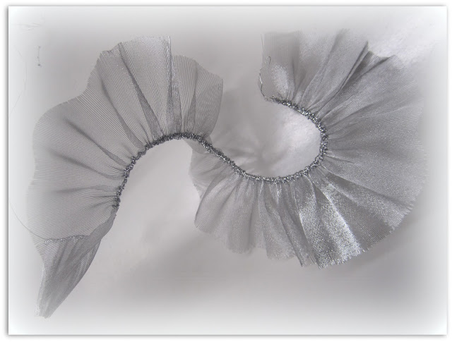 Kenkiin tein paljon pienemmät ruusut täysin samalla tavalla kuin yllä kuvatun ison ruusun. Nyt leikkasin nauhan puolivälistä halki, hapsutin leikatun reunan ja poimutin toisen reunan.